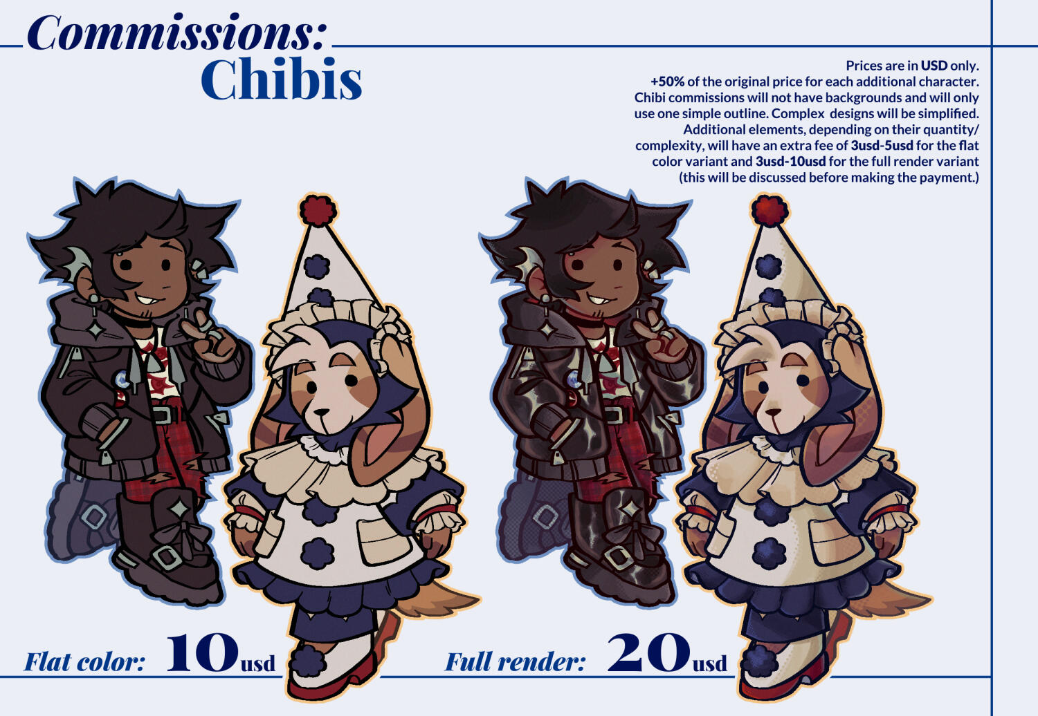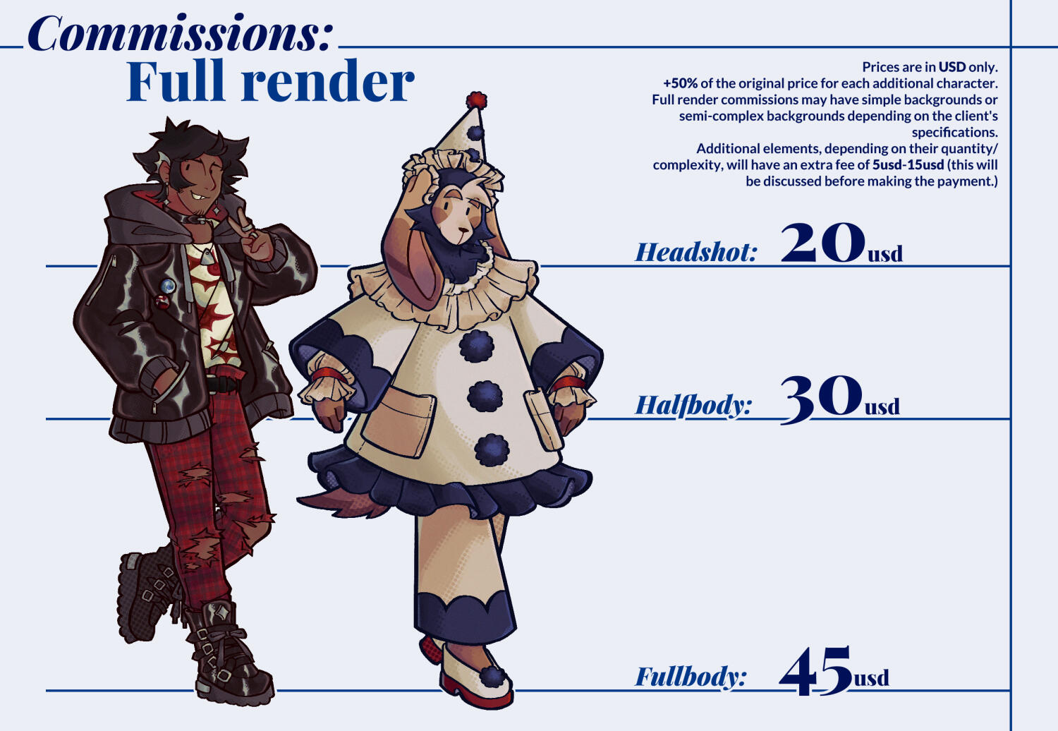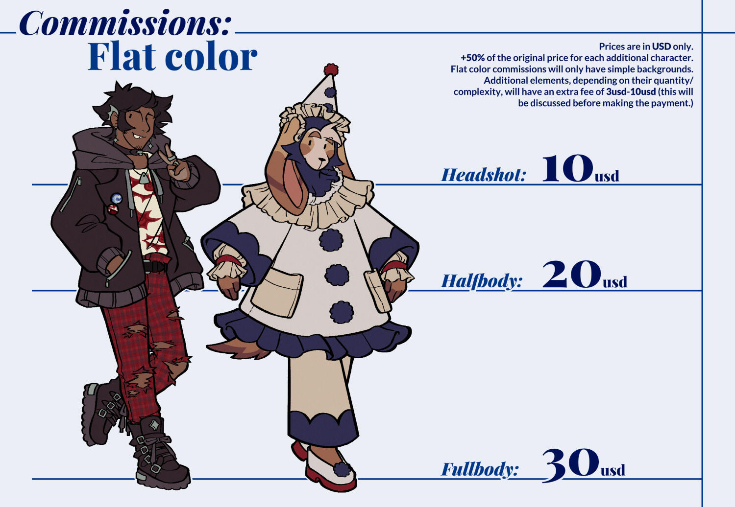 ● There are no additional fees or payments to be made that are not indicated in the information sheets for each type of commission, unless the commission is for commercial use. The artist may not request additional fees beyond those already stated or those agreed upon with the Client.